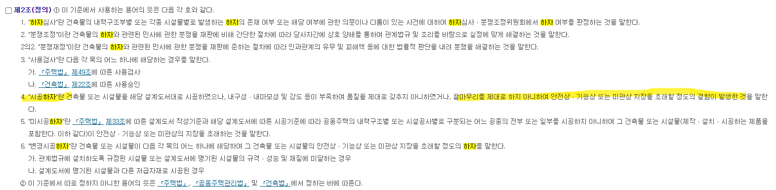 - 공동주택 하자판정기준: '기능 불량' 또는 '설치 미흡으로 인한 사용상의 문제'는 하자로 간주됩니다.