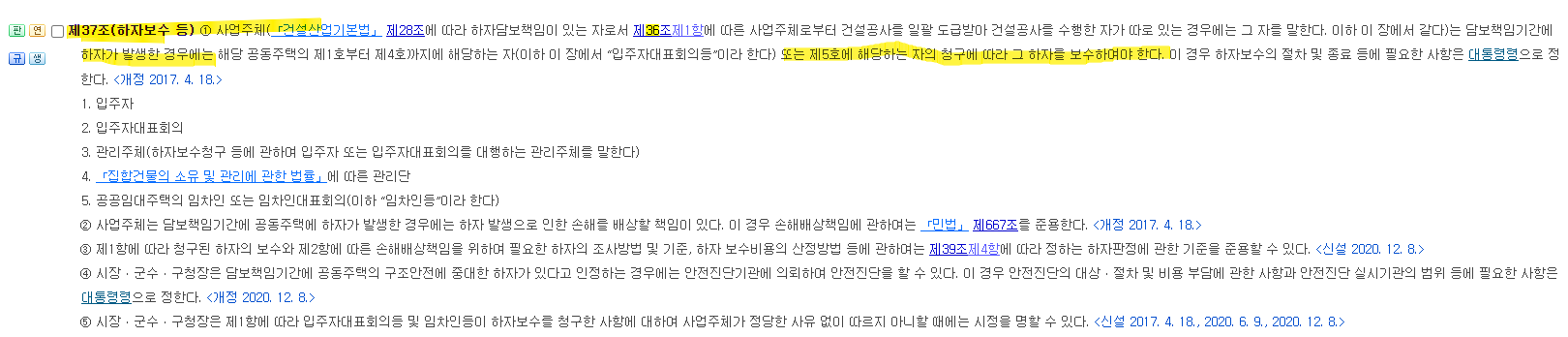 - 공동주택관리법 제37조: 시공사는 하자가 발생한 경우 입주자의 요청에 따라 무상 보수 의무를 집니다.